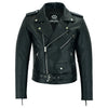 A fantastically made ladies biker leather jacket, made from full grain cowhide leather in the classic brando style. This is a style which never goes out of fashion and is still worn today so whether you wear this casually to a concert or for biker wear, this is the perfect womens leather jacket. We have incorporated all the classic details such as shoulder lapels, the half waist belt and zippered sleeves. The jacket comes with double quilted polyester lining, one removable liner, making it suitable for wear all year round. The half waist belt can be adjusted to your preferred fitting and the collar can be worn folded open or zippered up. For biker wear there are velcro pockets in the shoulders, back and elbows to slot CE armours into. With a number of pockets to hold your belongings, including two internal zippered pockets.