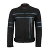 Styled with a sleek stand-up collar, snap button closure, and clean front zipper. Two bold yellow racing stripes add a signature biker look.